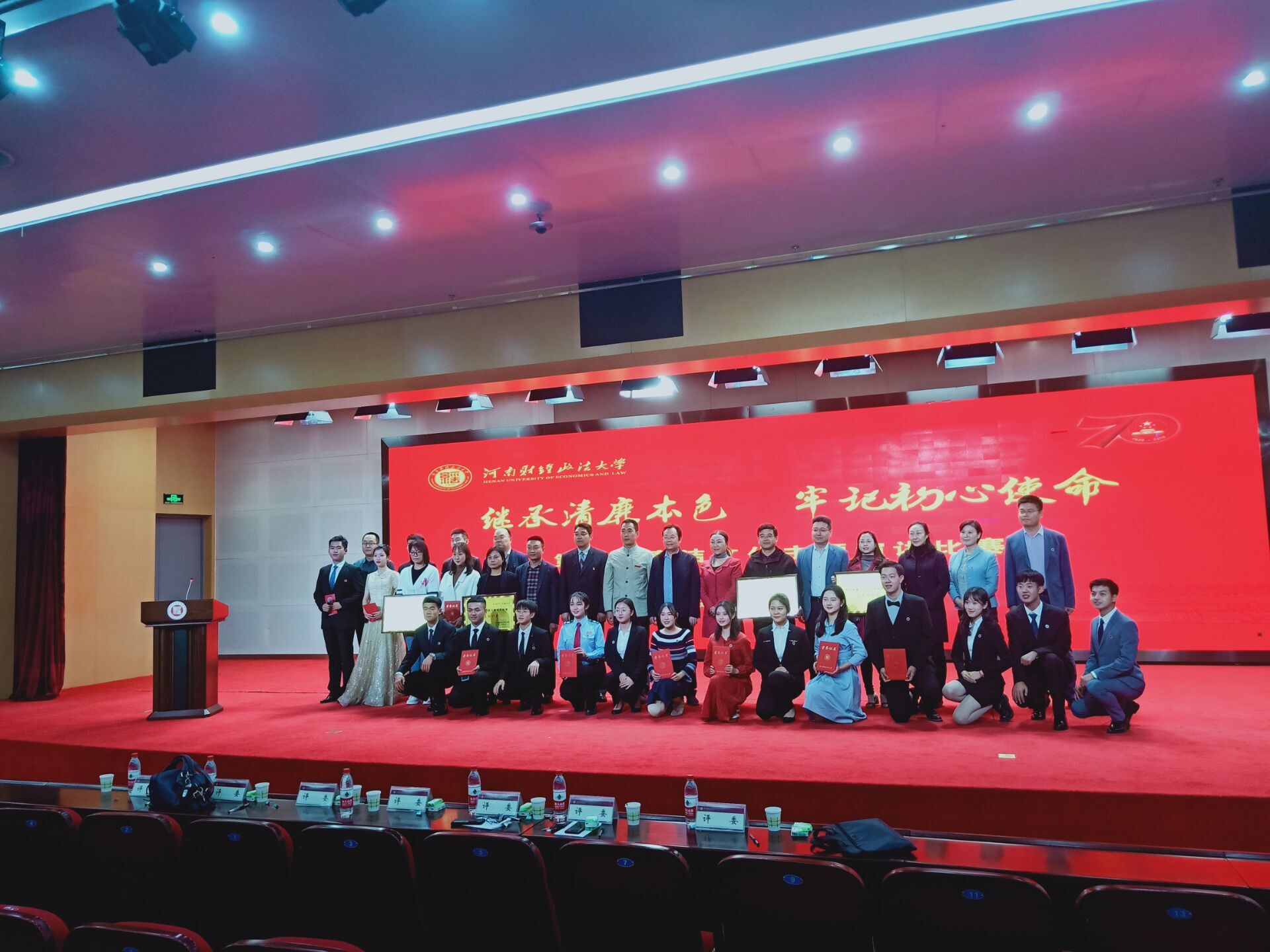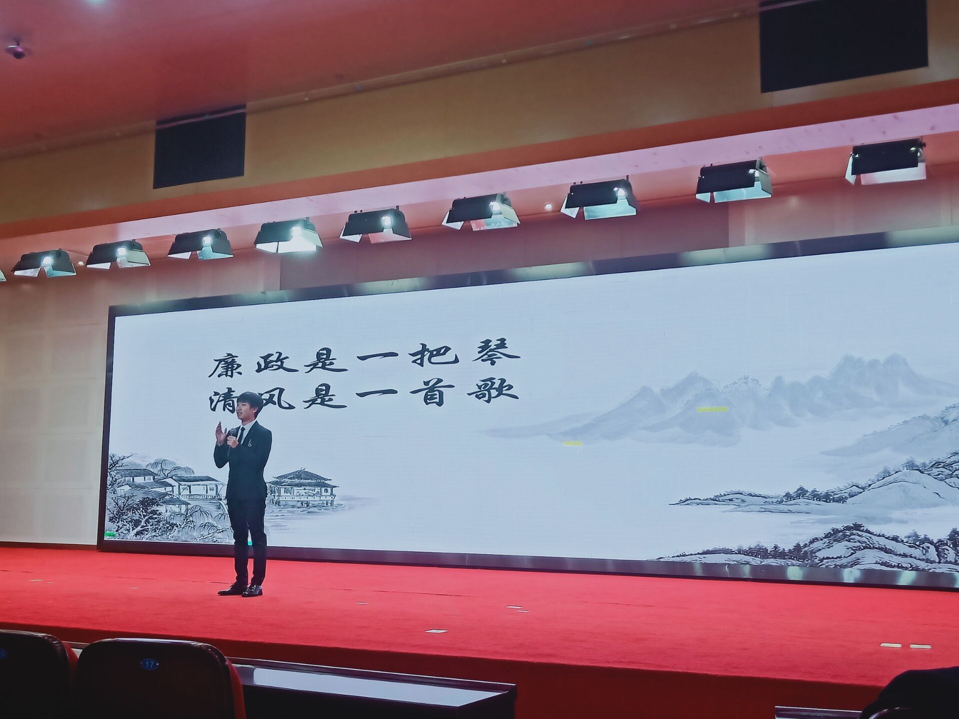 此次参赛,我院朱亦维各同学以“何须与我谈清廉之说”为题进行了精彩的演讲,在舞台上声情并茂地将廉洁这一传统美德表述地淋漓尽致。选手演讲完毕后,由在座领导依据演讲内容、语言表达、精神面貌等标准进行评比颁奖。